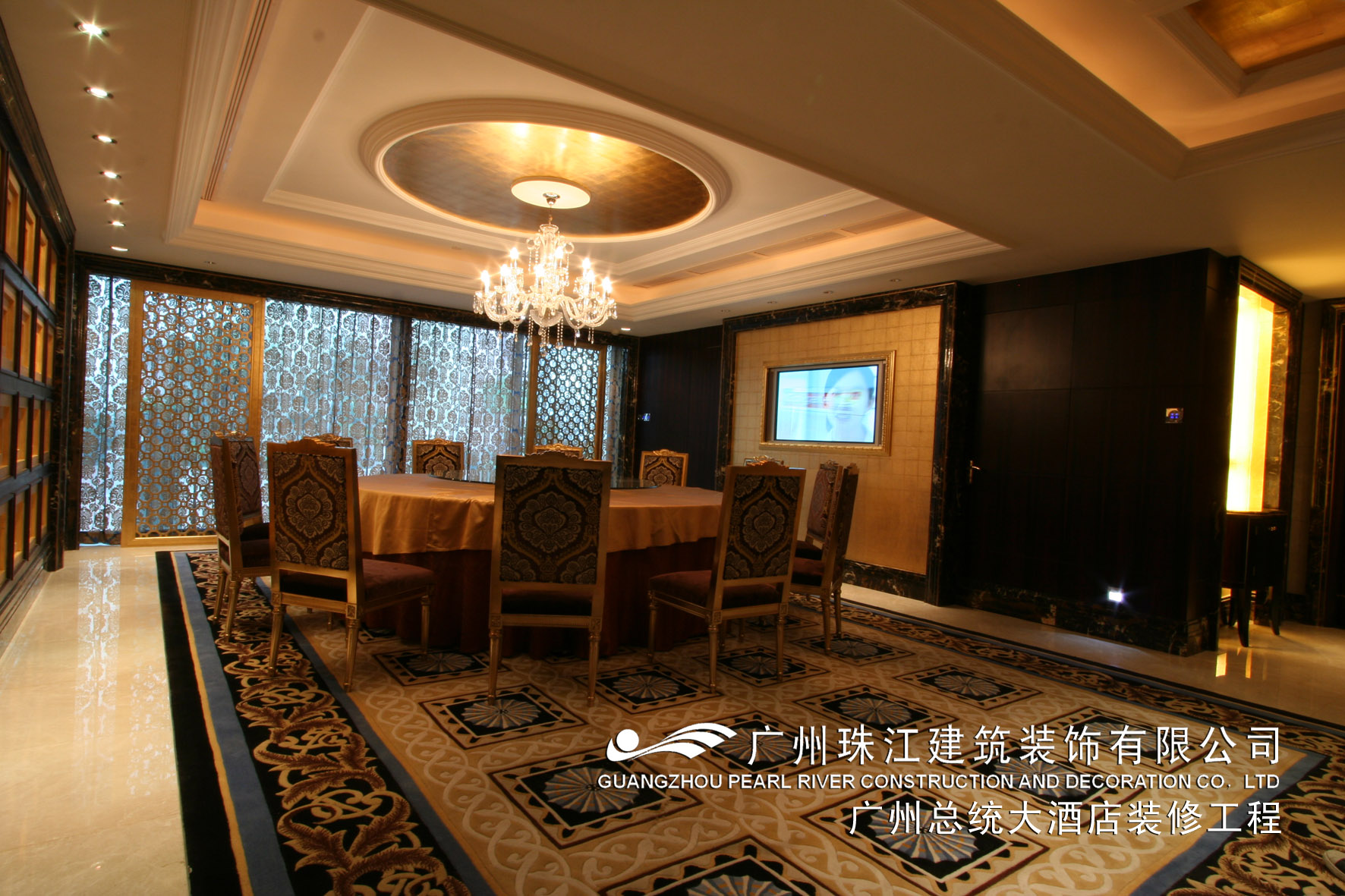开业于一九九五年的总统大酒店是由广州海印实业集团有限公司精心策划的四星级涉外商务酒店。位于广州市天河区商业繁华地带。拥有全新装修的各类高级客房215间;可供大约1000人用餐的中、西式餐厅;配备可容纳600人以上的国际会议中心,会议厅的无柱式设计气派非凡及专业的会展设施、先进的视听设备,适合举办婚宴、会议、商务展览、产品推介、公司庆典等各种规模的会展及宴会;酒店康体、娱乐设施齐备,设有健康中心、沐足阁等。